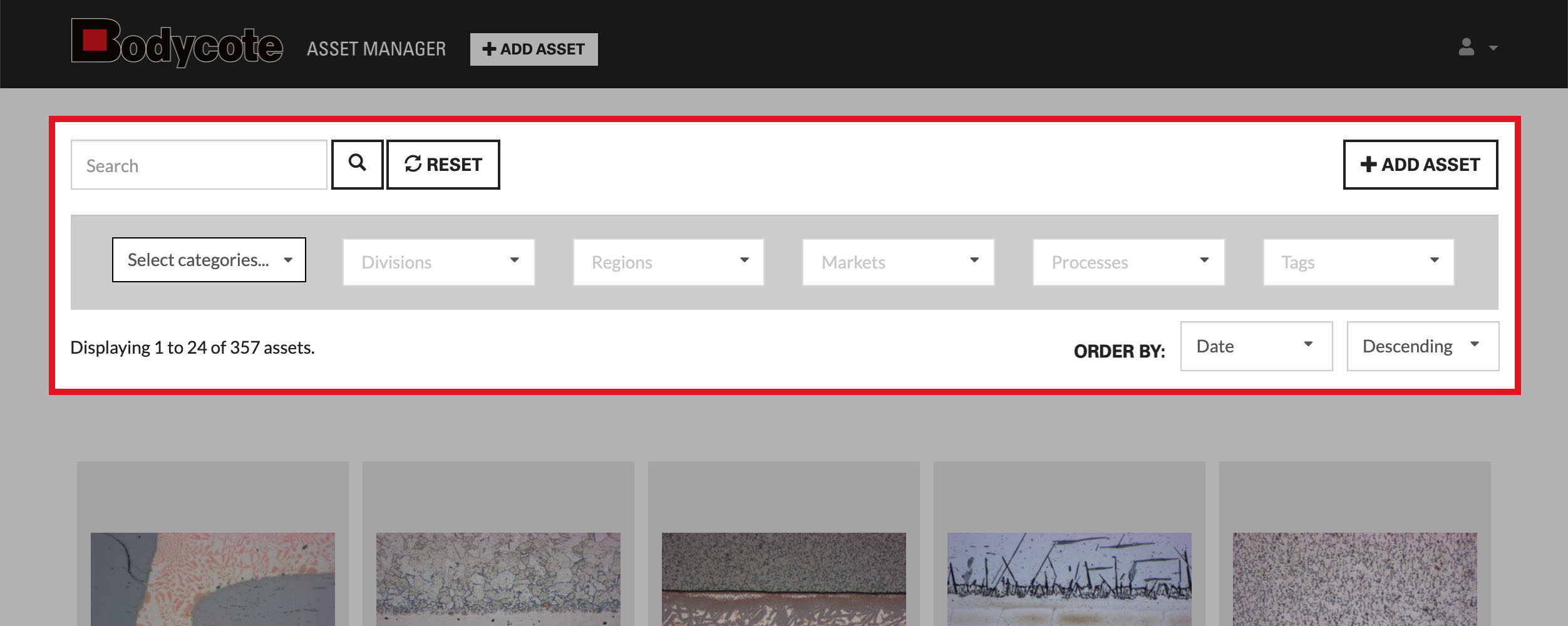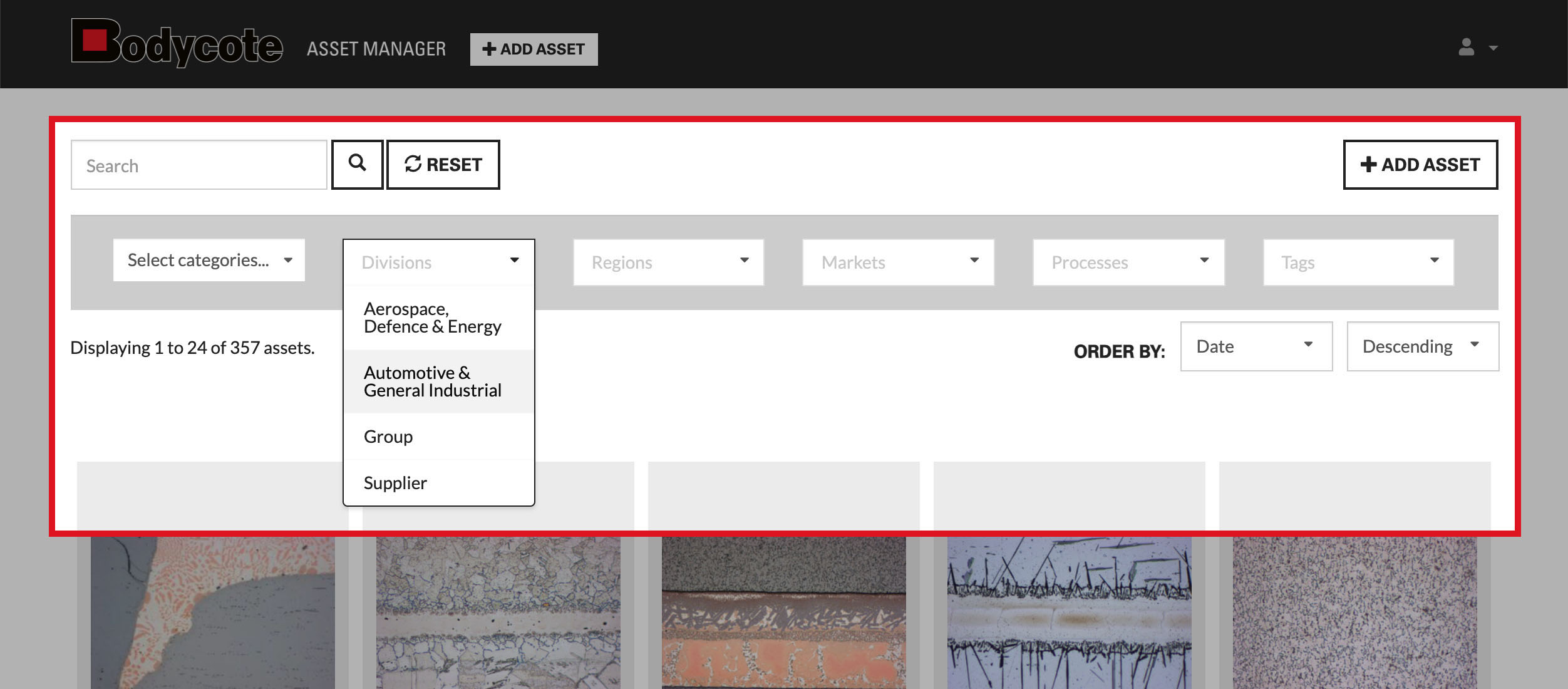 The search and filter bar is there to help you find the asset(s) that you are looking for. You can either search using a specific keyword or filter the results using the set of dropdowns (categories, divisions, regions etc) in the grey bar. You can also change the order of your search results, either by date or name and either ascending or descending order.